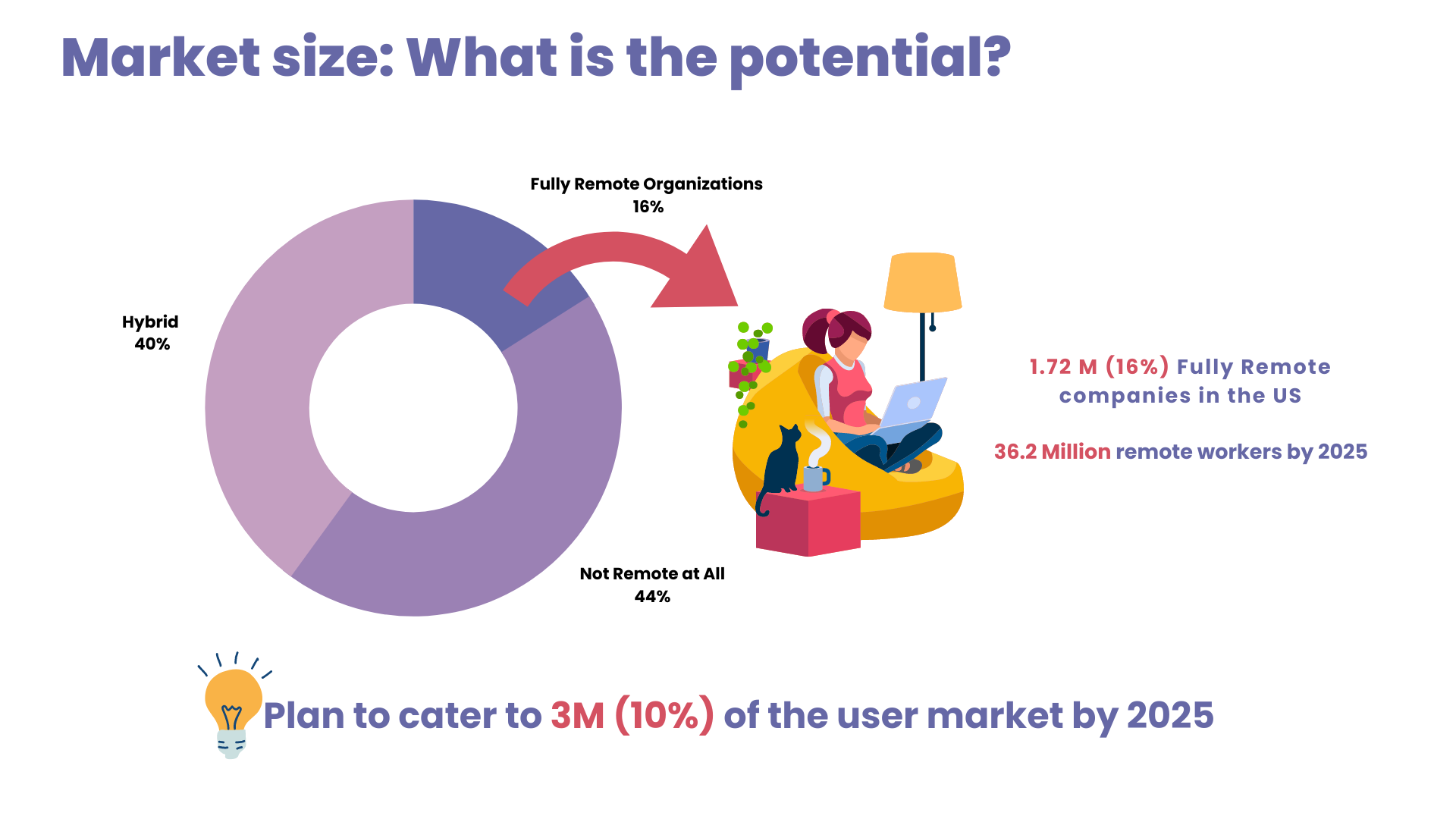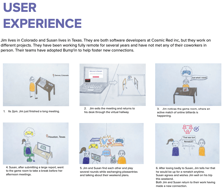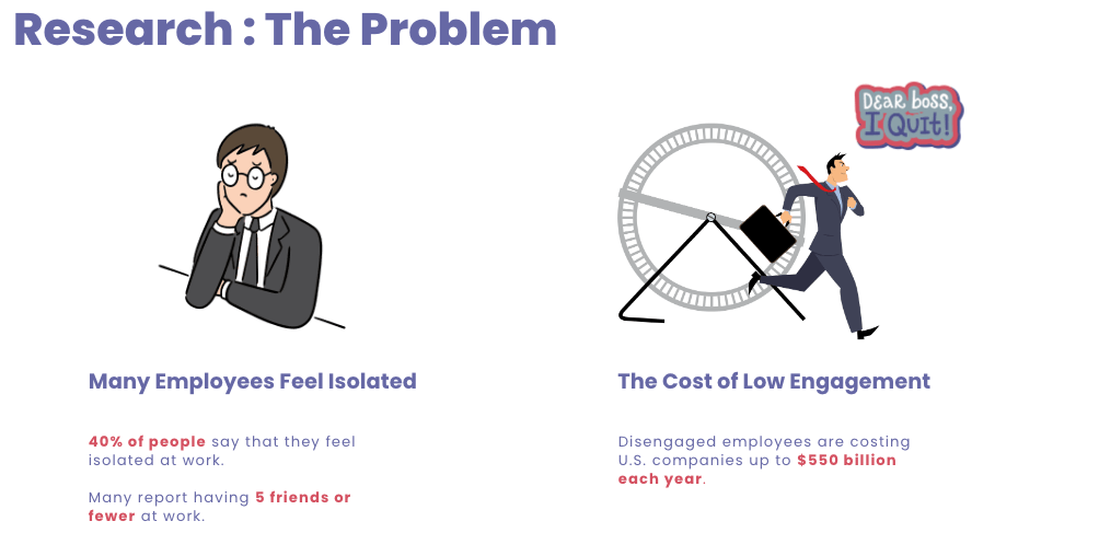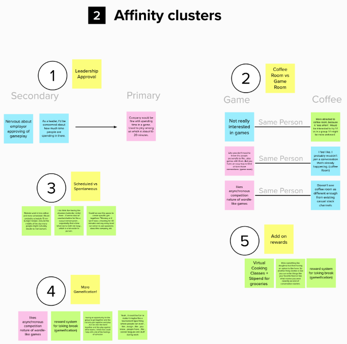 After several brainstorming sessions and research synthesis, we refined the problem into the following How Might We statement:HMW re-imagine how employees working in fully remote organizations build peer relationships by enabling them to make connections outside of formal work meetings and scheduled/planned interactions, so that they may improve their team dynamics, performance, and happiness in their job.