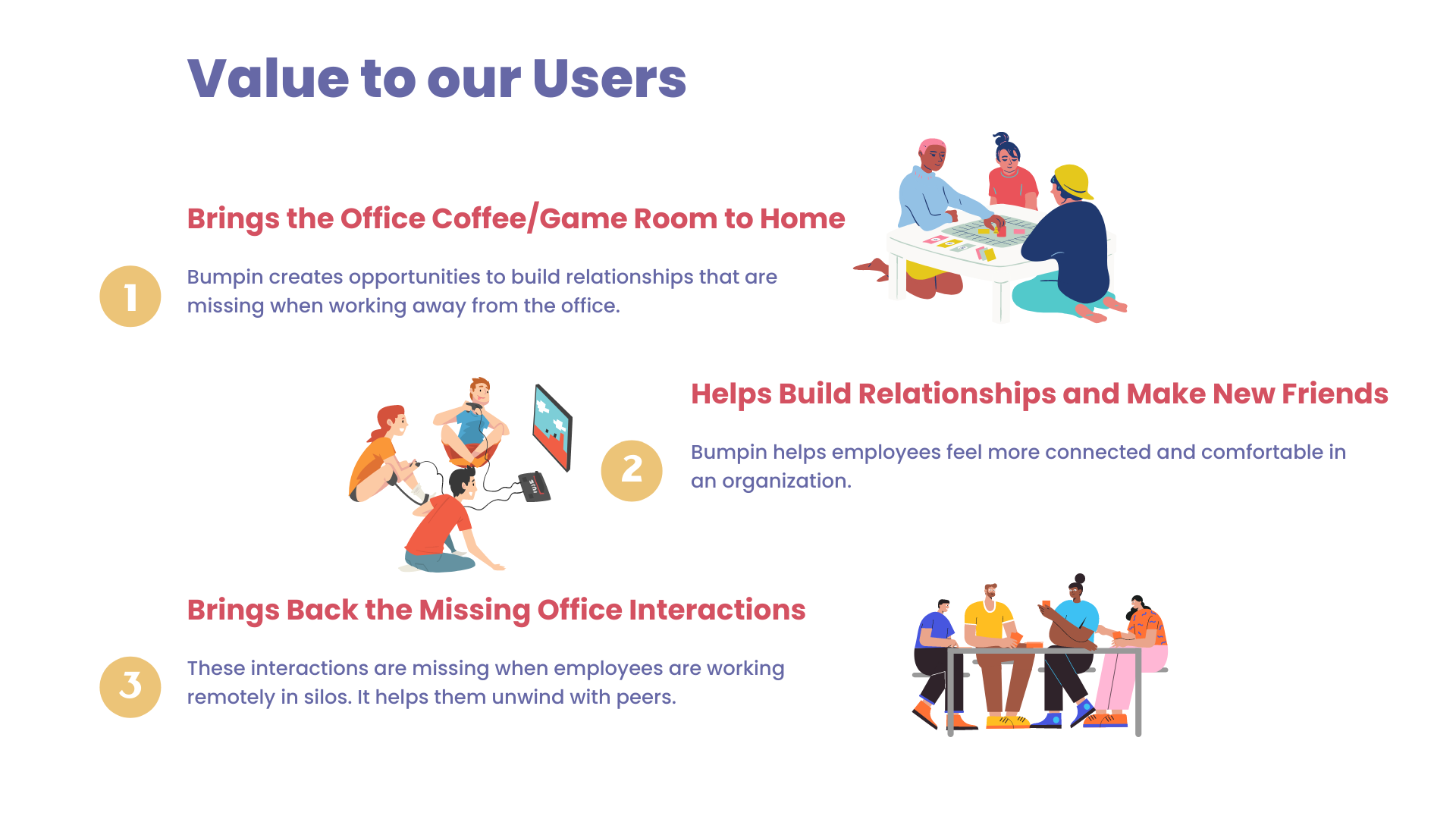 Bumpin is a first-of-its-kind Workplace Relationship Platform that leverages the power of play to provide remote employees with casual opportunities for making meaningful connections at work, that will lead to improved team dynamics, performance, and overall work-life happiness!